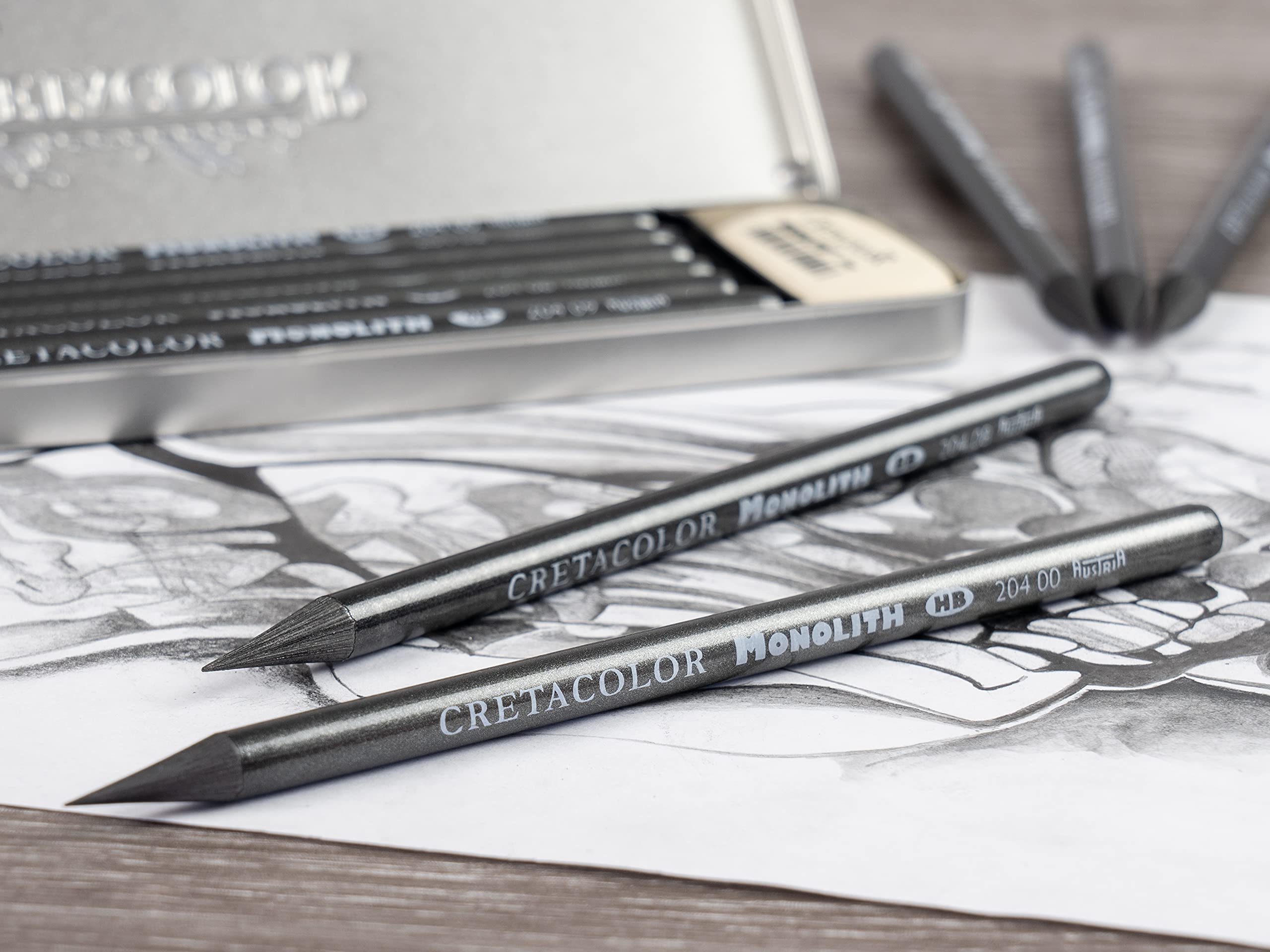 Monolith graphite: The pencil consists of pure lead and is only covered in a thin layer of varnish. Wide and fine smears can be easily achieved with one and the same pencil. Tips as usual. The watercolorable Monolith Graphite is particularly suitable for watercolor. The pencil is available in 6 gradations: 9B, 8B, 6B, 4B, 2B, HB.